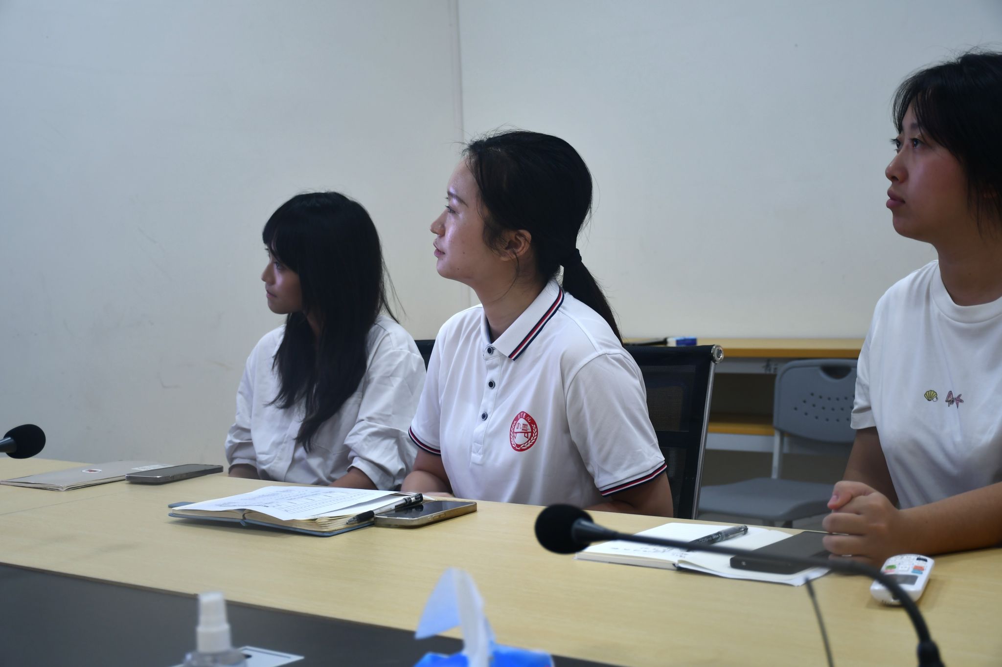 指导老师赵菡果欢迎新成员加入,提出“高度、深度、精度、速度、温度、热度”六“度”要求,分别对应立足自贸港定使命、深研内容提价值、严控细节求精准、紧跟热点保质效、团队协作有温情、创新形式传正能量。
